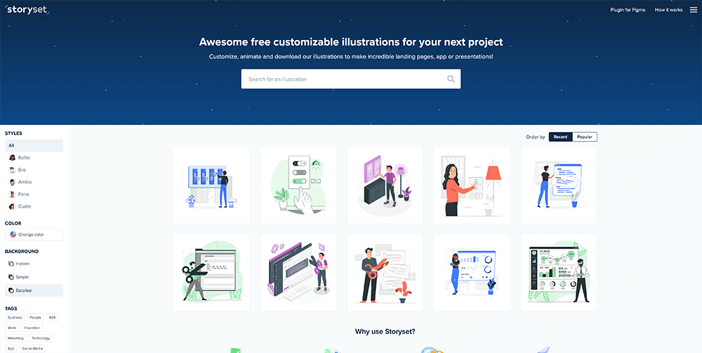 Free customizable illustrations. On this website you can search for an illustration and then choose between different styles to match your design. Once selected the illustration, you can chose the colors and show/hide different layers. You can also animate your design directly on their website and export the animation as SVG+CSS, Javascript, GIF or Video formats.